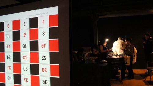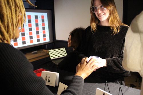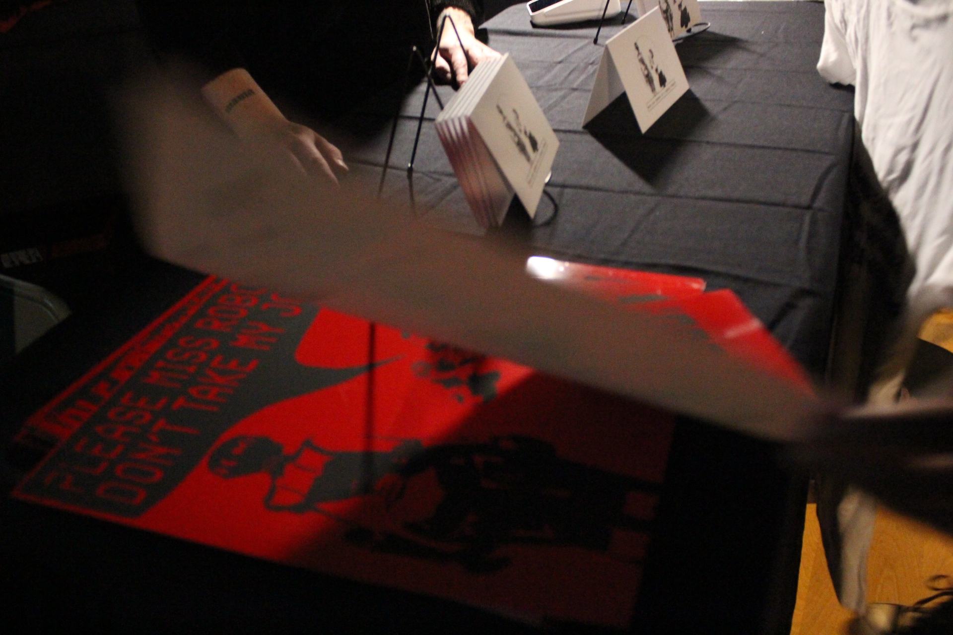 Next to the screening, a merch table acts as the simulated retail work environment supplied with clothing, posters, and postcards. The Worker manages the table while speaking through an AI voice and AI script that is operated by a team of performers called the “Brain.” The Brain team is visible to the public. The performers roles are described below: